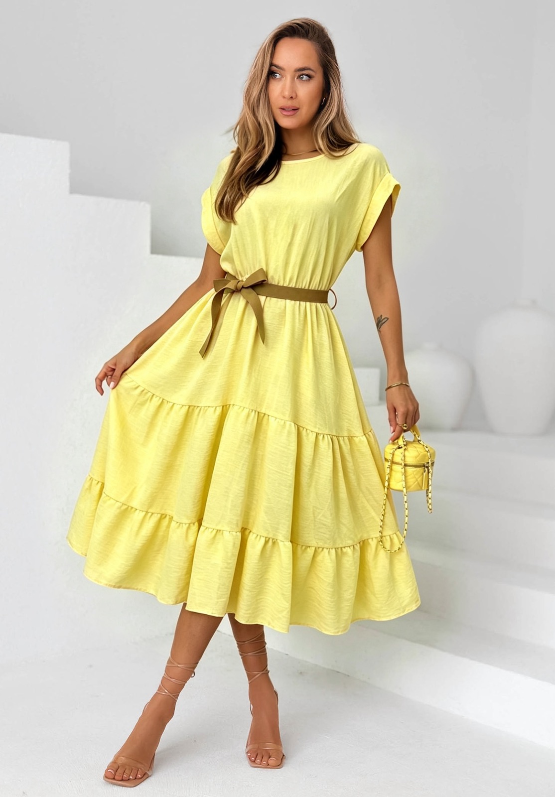 Φόρεμα midi με χαλαρό μανικάκι, στρογγυλή λαιμόκοψη και βολάν στο τελείωμα. Διαθέτει αποσπώμενη ζώνη κορδέλα στη μέση
